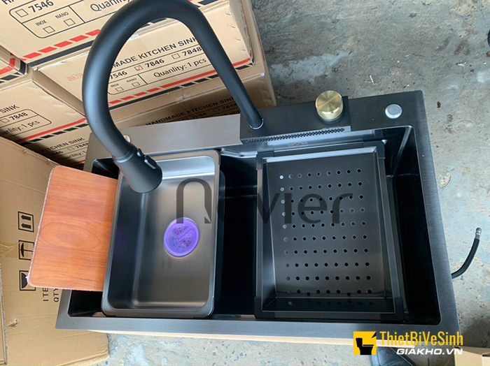 - Bộ sản phẩm bao gồm : chậu rửa chén, bộ xả, thớt, khay rửa hoa quả, khay phụ, vòi rút kèm vòi rửa ngang.