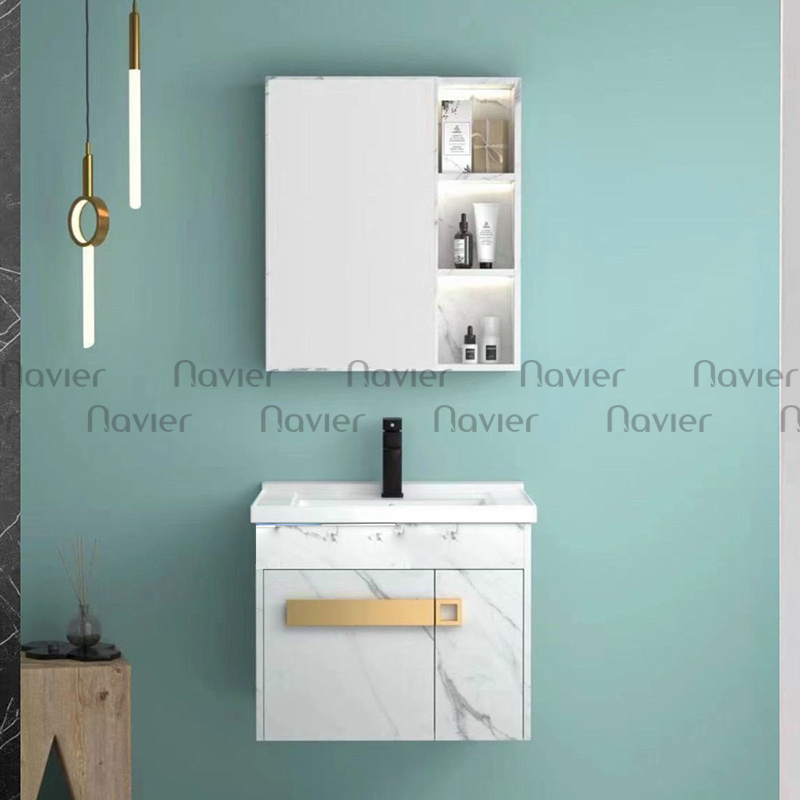 Bộ Tủ Chậu Lavabo PVC Vân Mây Trắng Kèm Tủ Gương Navier NV-449T