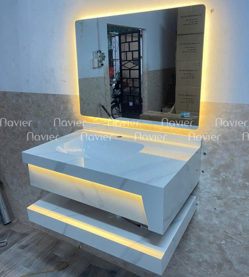 - Bàn đá lavabo với thiết kế 2 tầng giúp bạn để được nhiều đồ dùng cá nhân hơn, tiết kiệm không gian sử dụng.