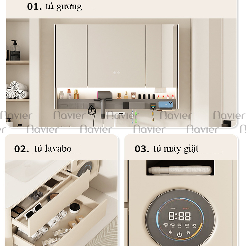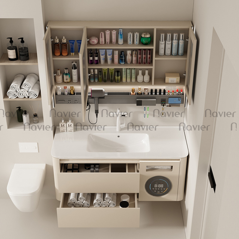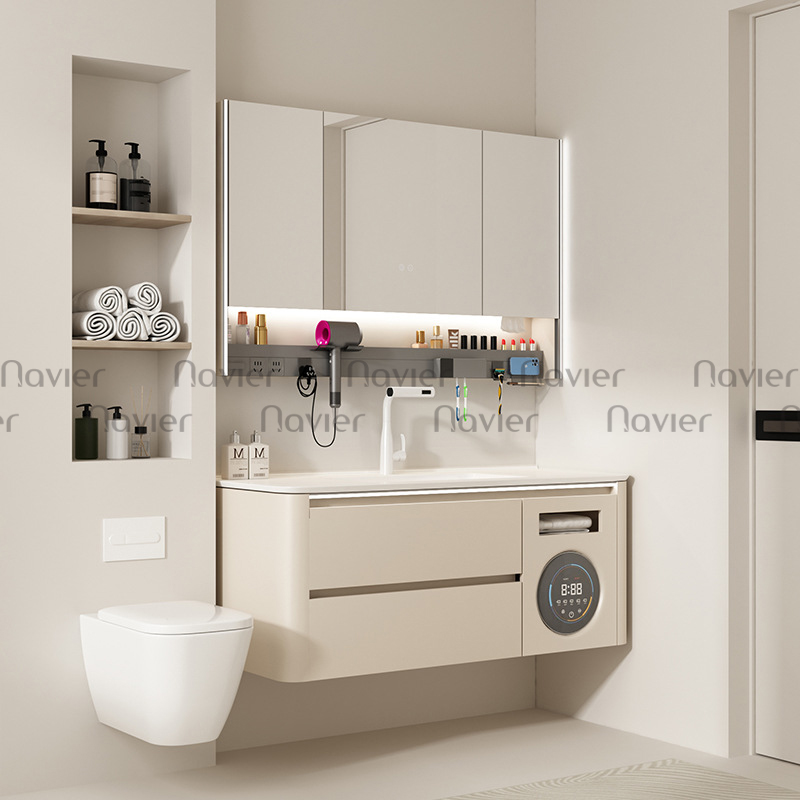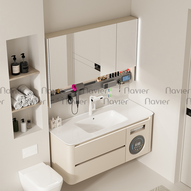 Bộ Tủ Chậu Lavabo Tràn Viền Kèm Máy Giặt Mini Navier NV-1807 là sự kết hợp hoàn hảo giữa tiện ích và thẩm mỹ, với thiết kế hiện đại, gọn gàng, phù hợp cho nhiều không gian phòng tắm. Sản phẩm không chỉ tích hợp chậu lavabo sang trọng mà còn đi kèm với máy giặt mini tiện lợi, giúp tối ưu hóa không gian sử dụng trong nhà tắm.