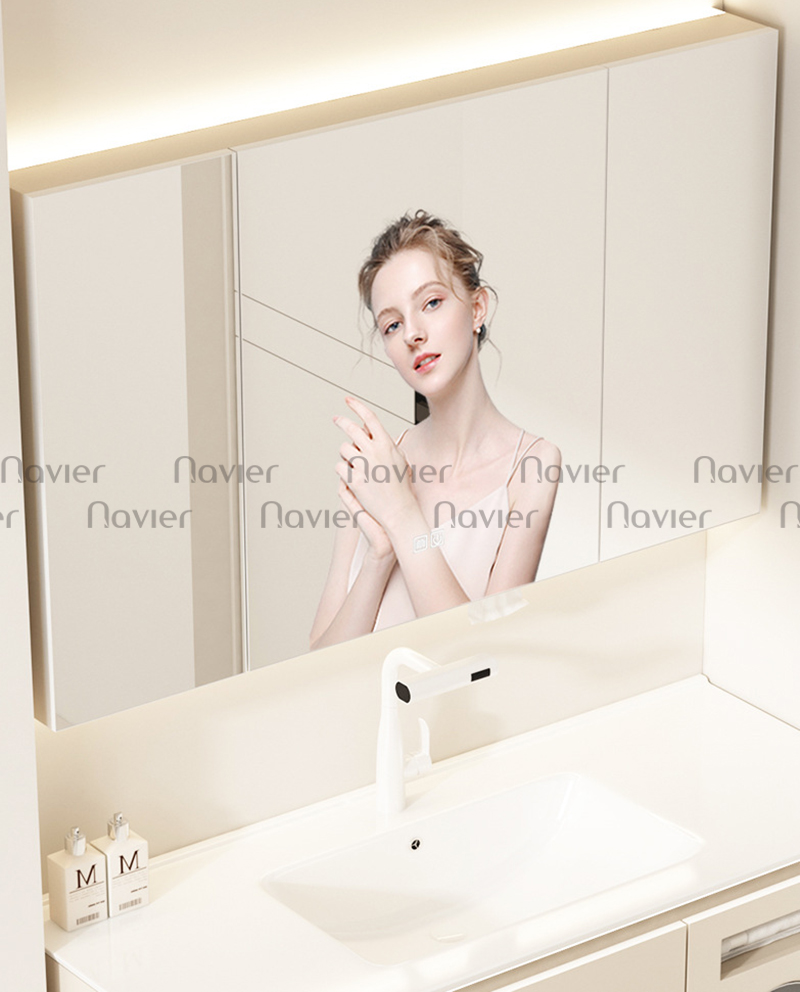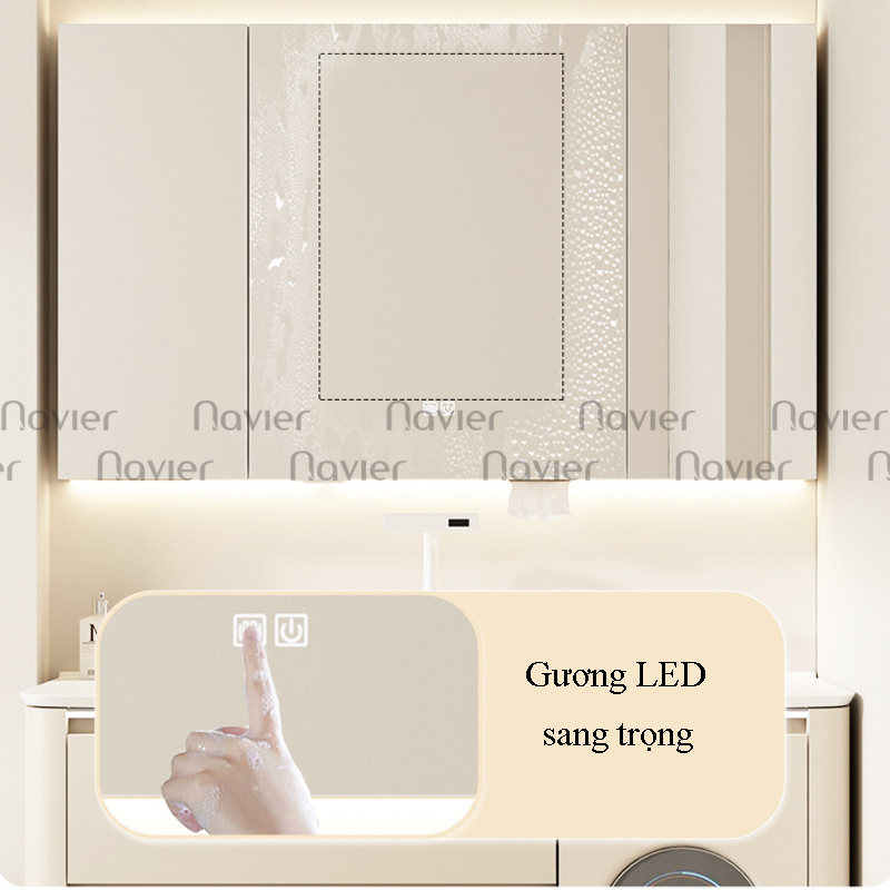 - Tủ gương LED tiện ích: Thiết kế rộng rãi, chứa đựng được nhiều đồ dùng cá nhân, đèn LED giúp dễ dàng sử dụng trong mọi điều kiện ánh sáng.