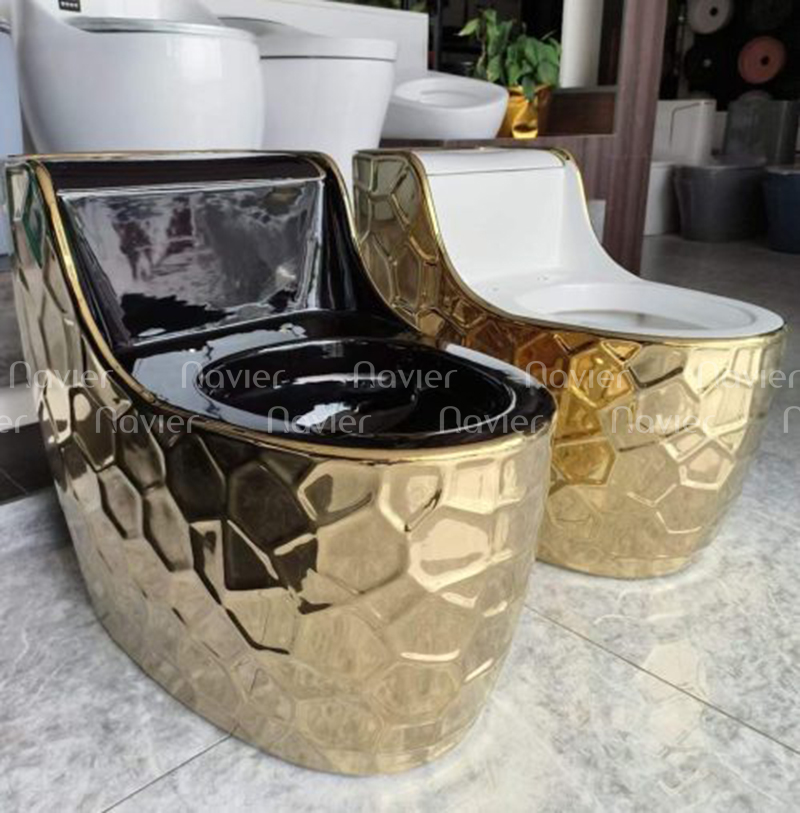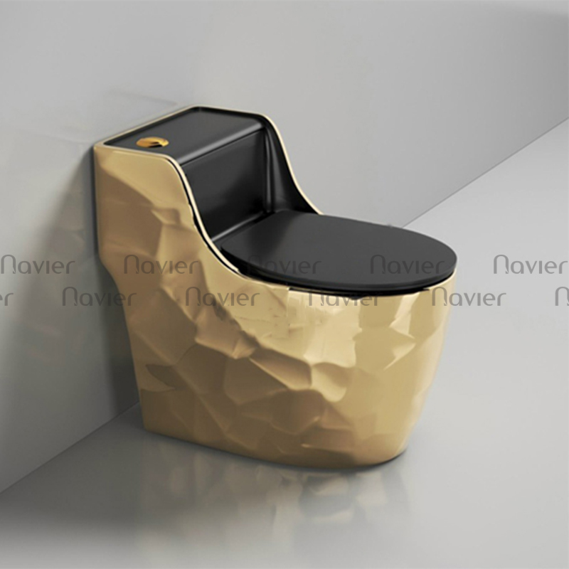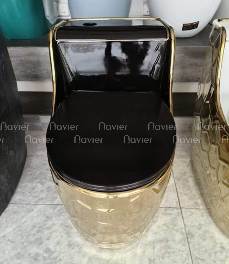 Bồn Cầu 1 Khối Vàng Nắp Đen Nút Xả Lệch Cao Cấp Navier NV-1033