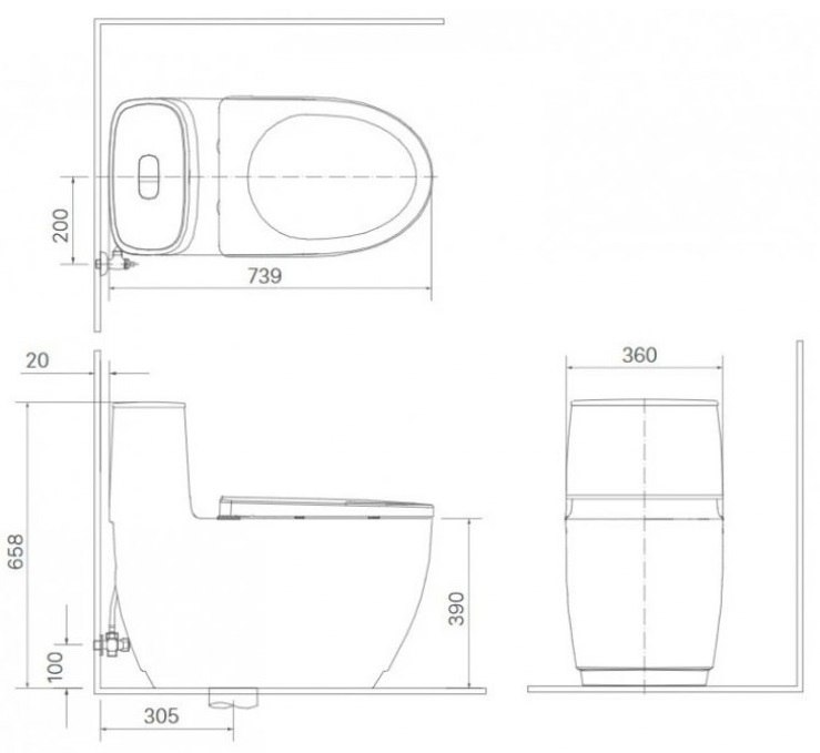 Kích thước bồn cầu: 739 x 360 x 658 mm (DxRxC)