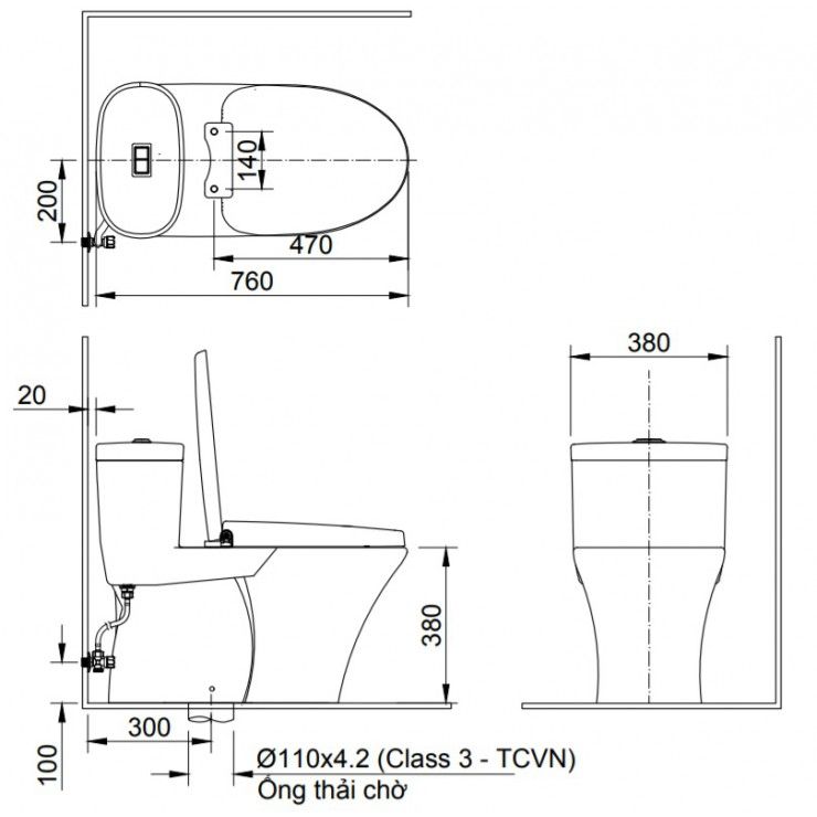 - Kích thước bồn cầu: 736 x 394 x 650 mm (DxRxC)