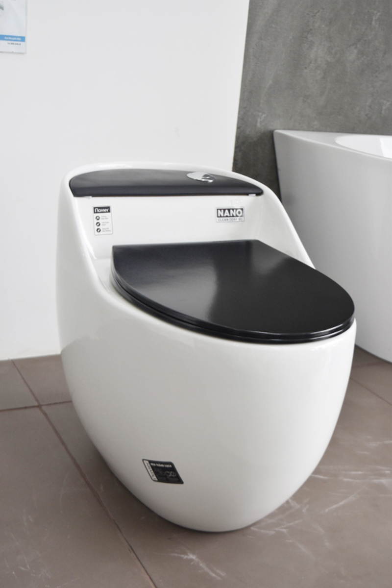 Thiết kế sang trọng, hiện đại: Kiểu dáng hình trứng độc đáo, kết hợp màu trắng tinh tế với nắp đen tạo điểm nhấn nổi bật, phù hợp với nhiều phong cách phòng tắm.