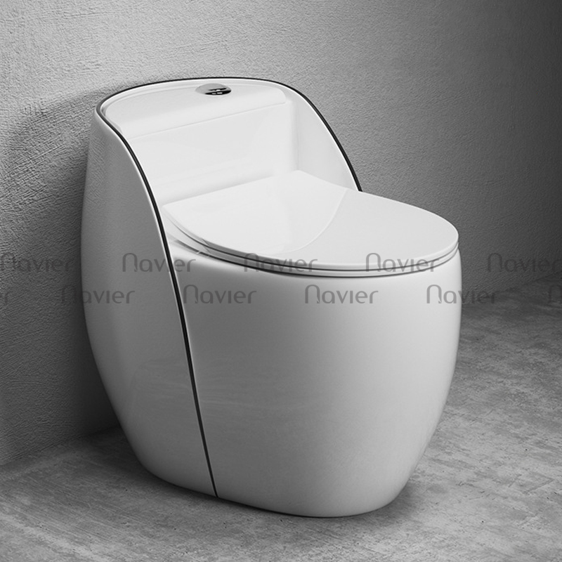 - Thiết kế độc đáo: Bồn cầu trứng trắng viền đen nút xả lệch Nav NV-1034 có hình dáng trứng trắng với viền đen làm điểm nhấn, tạo nên một phong cách hiện đại và sang trọng cho không gian nhà tắm.