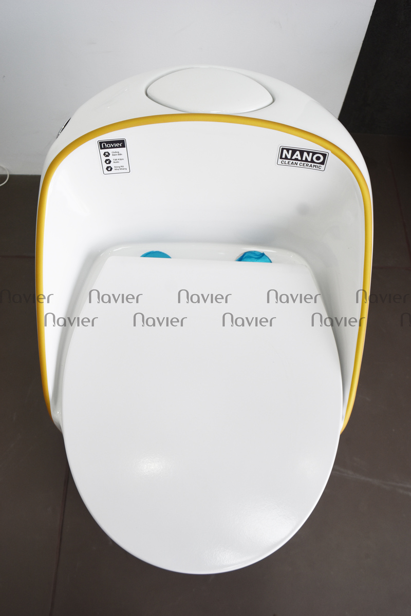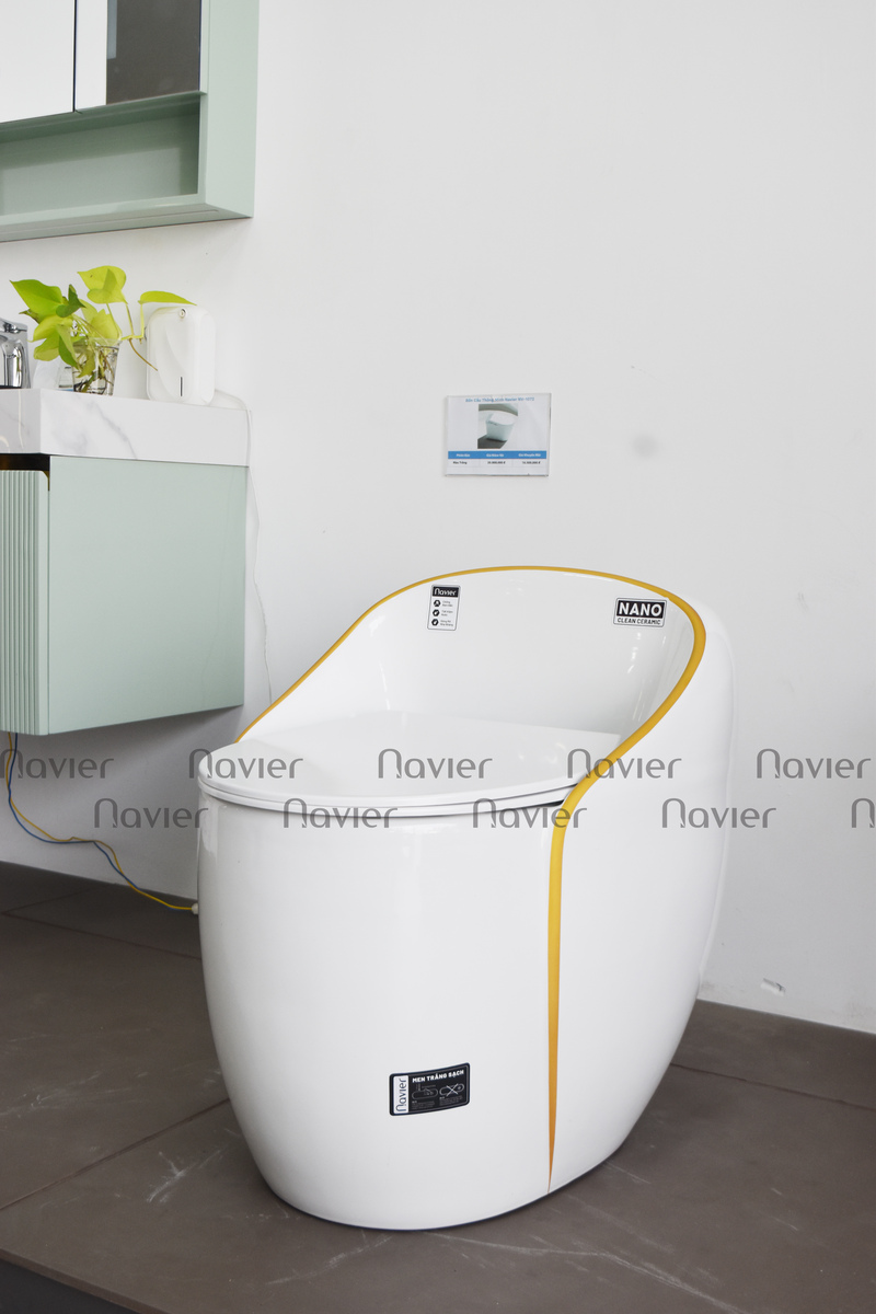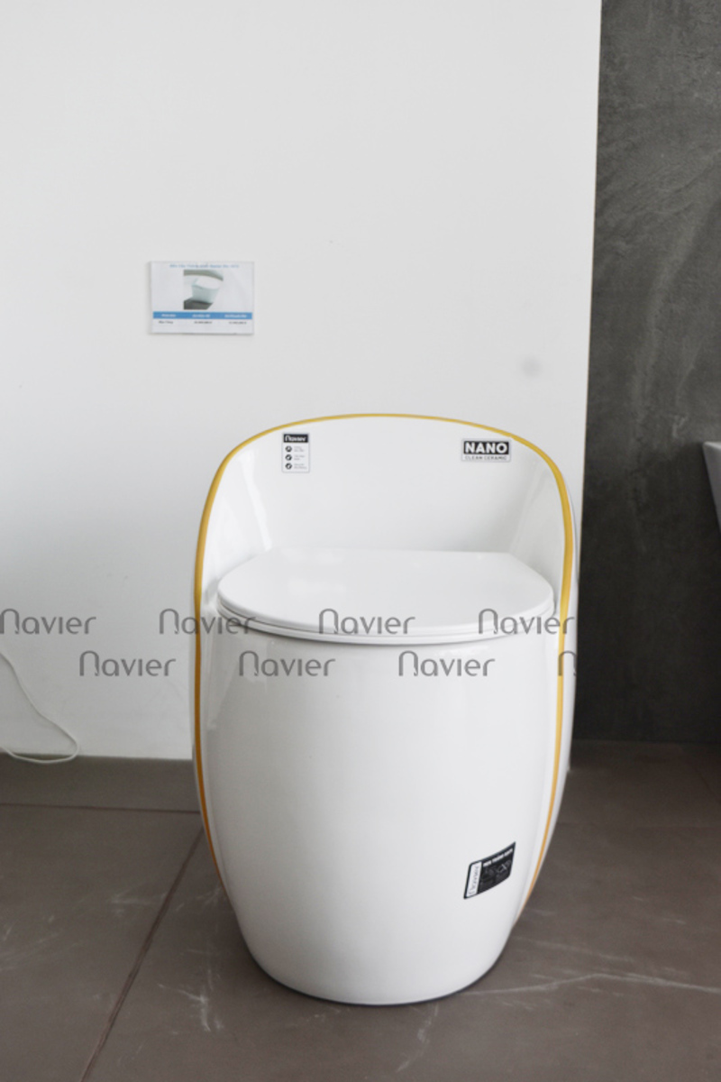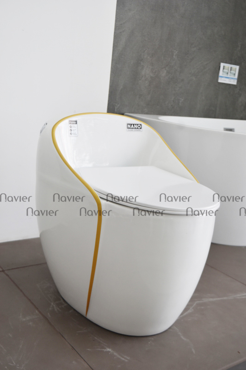 Thiết kế độc đáo: Bồn cầu Navier NV-1028 có hình dáng trứng trắng với viền vàng làm điểm nhấn, tạo nên một phong cách sang trọng và hiện đại cho không gian nhà tắm.
