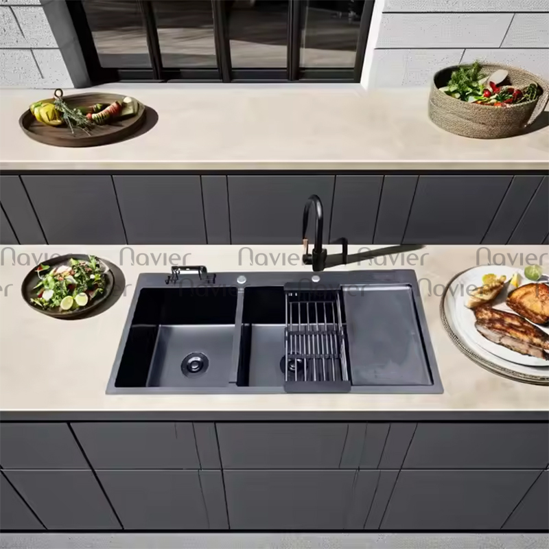 Chậu chén 2 ngăn lệch Inox304 chuẩn 100% phủ nano đen Navier NV-8245LD304