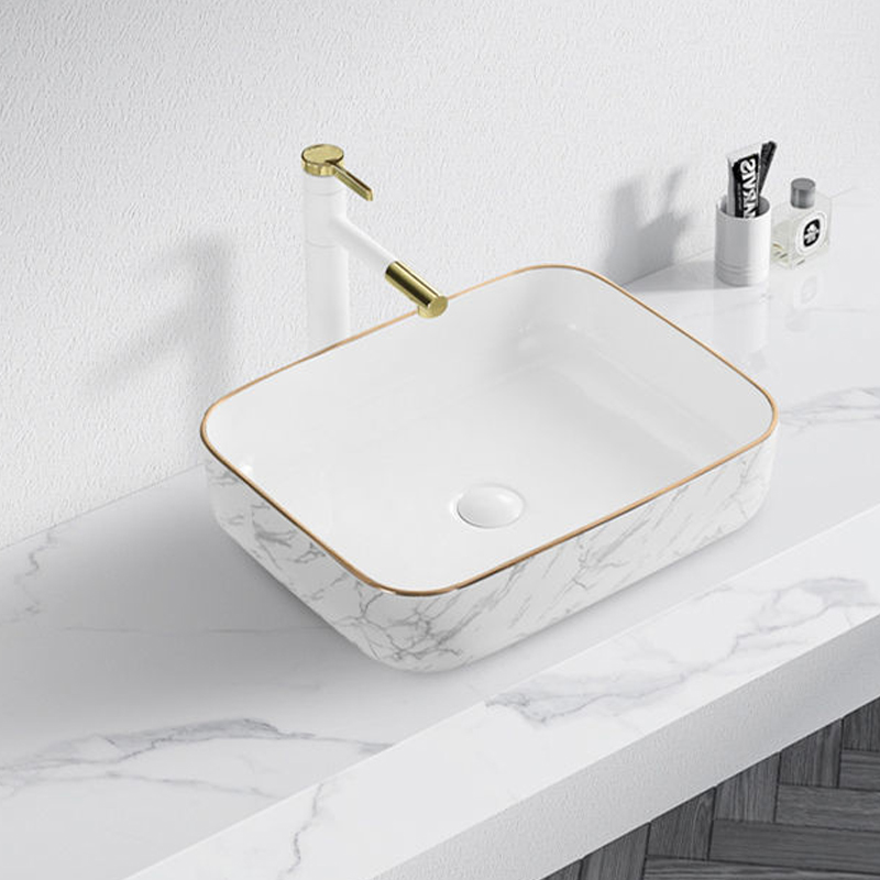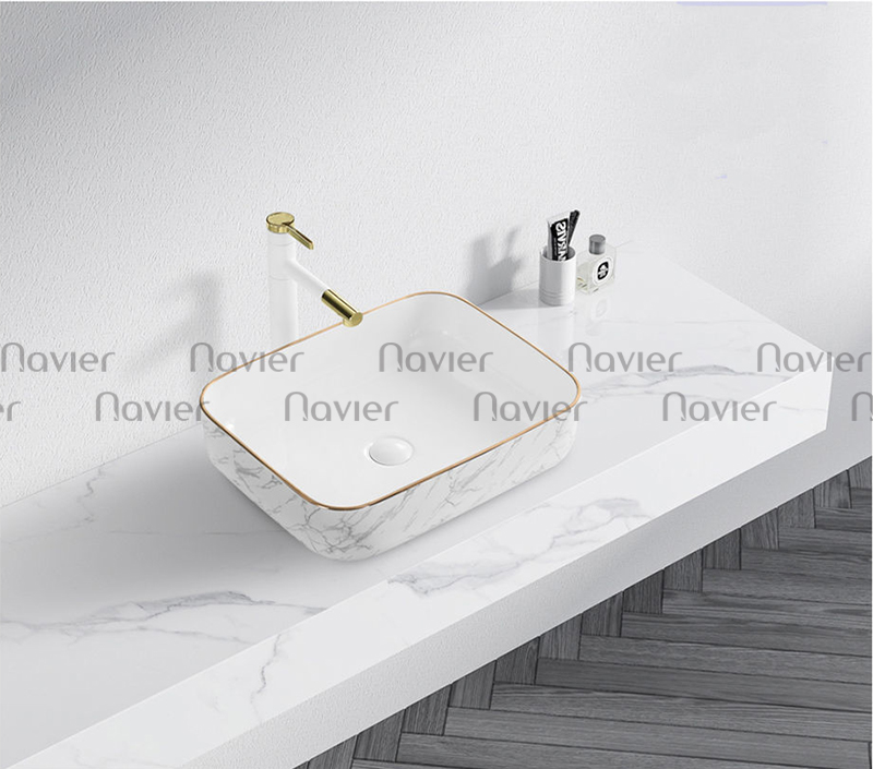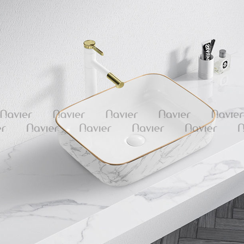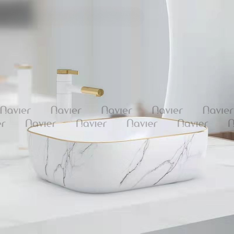 Chậu Rửa Mặt Đặt Bàn Trắng Vân Mây Viền Vàng Navier NV-333VM