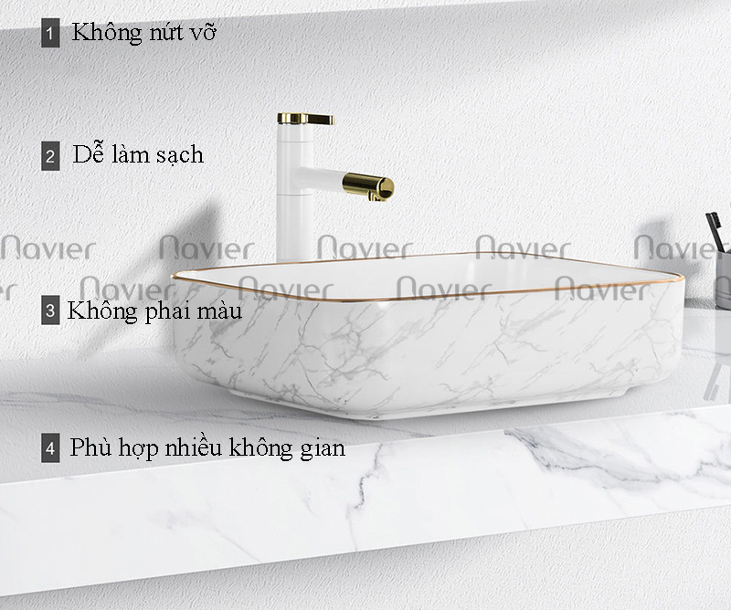 Chậu Lavabo Navier NV-333VM được làm từ chất liệu sứ cao cấp, đảm bảo độ bền và độ bền màu cao. Thiết kế của sản phẩm rất đẹp mắt, tinh tế và hiện đại, với màu trắng vân mây và viền vàng bao quanh chậu lavabo, tạo nên điểm nhấn độc đáo và sang trọng.