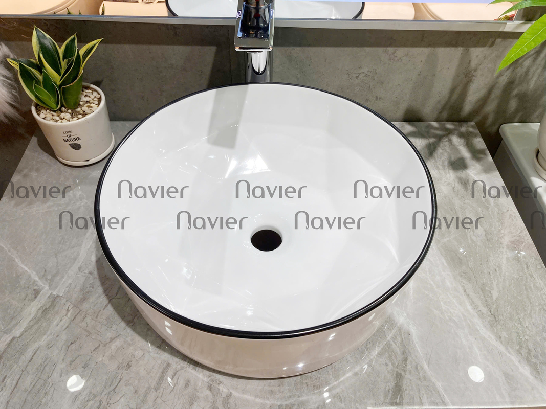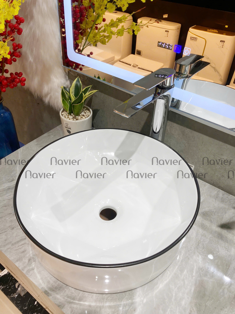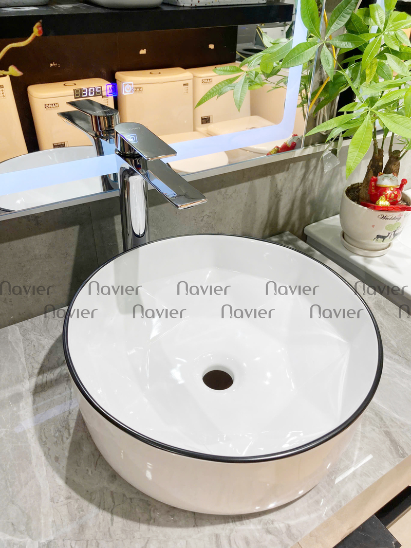 - Mẫu chậu lavabo đặt bàn tròn sứ trắng viền đen Navier NV-322 này cũng rất dễ dàng vệ sinh và làm sạch, giúp giữ cho không gian nhà tắm luôn sạch sẽ và thoáng mát.