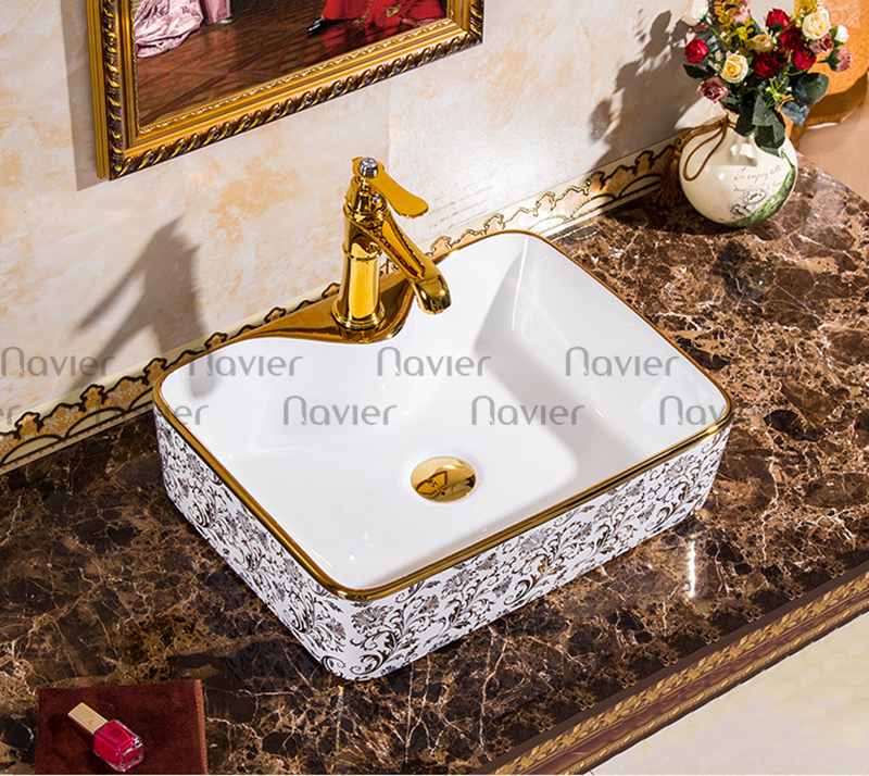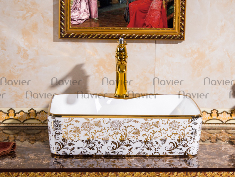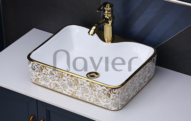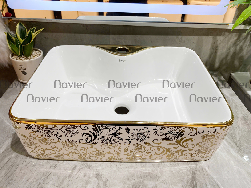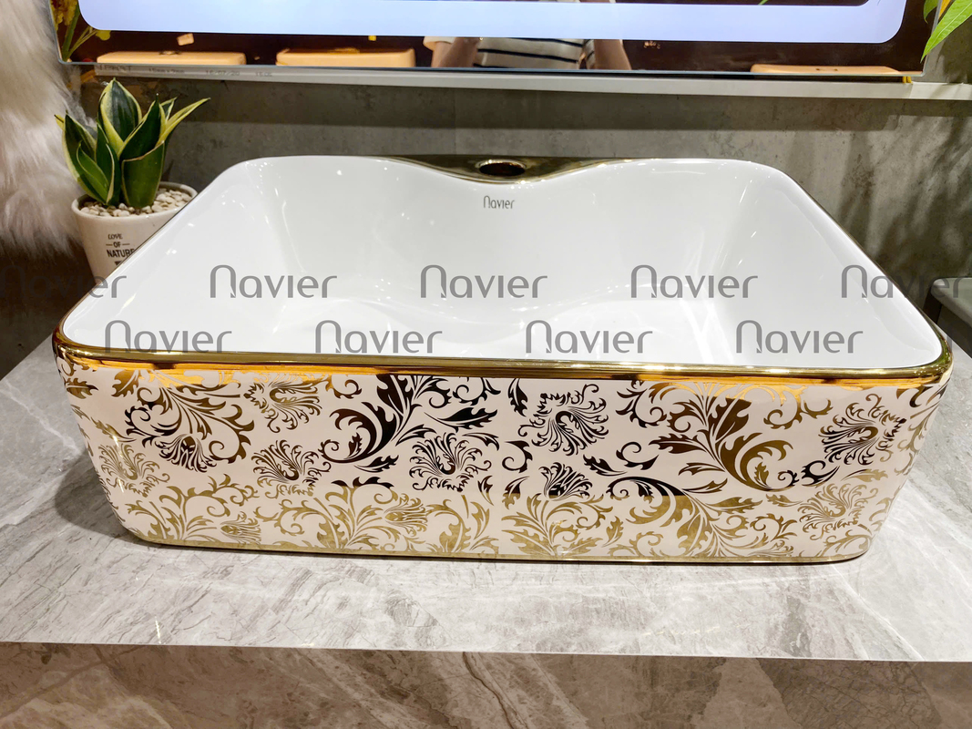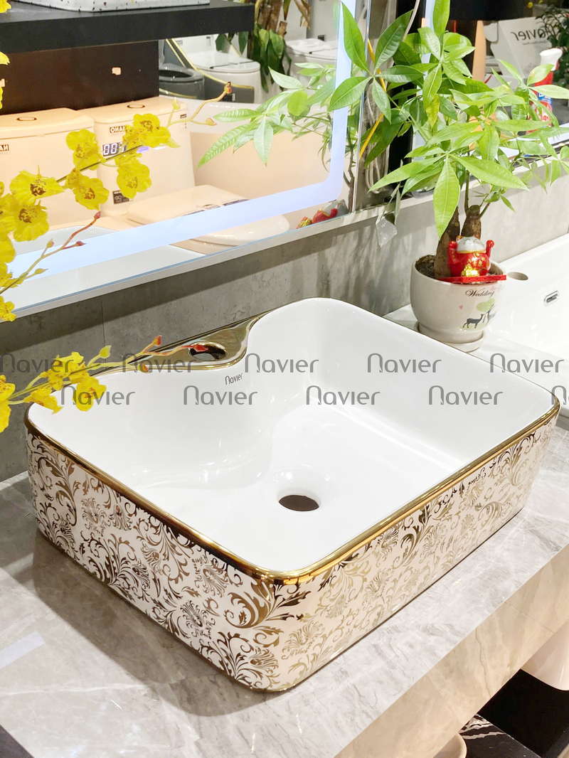 Chậu lavabo vuông đặt bàn hoa văn vàng Navier NV-407 làm từ chất liệu sứ nung ở nhiệt độ cao nên có độ bền rất tốt, có khả năng chống lại được những tác động từ bên ngoài mà không bị biến dạng. Sản phẩm được đánh giá rất cao với họa tiết hoa văn dạng cổ điển độc đáo, nếu được lắp đặt trong các căn phòng tắm phù hợp sẽ giúp căn phòng tắm trở nên nổi bật hơn rất nhiều.
