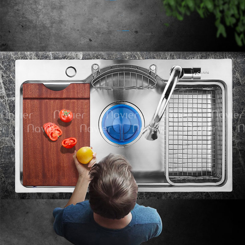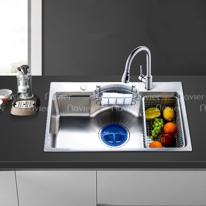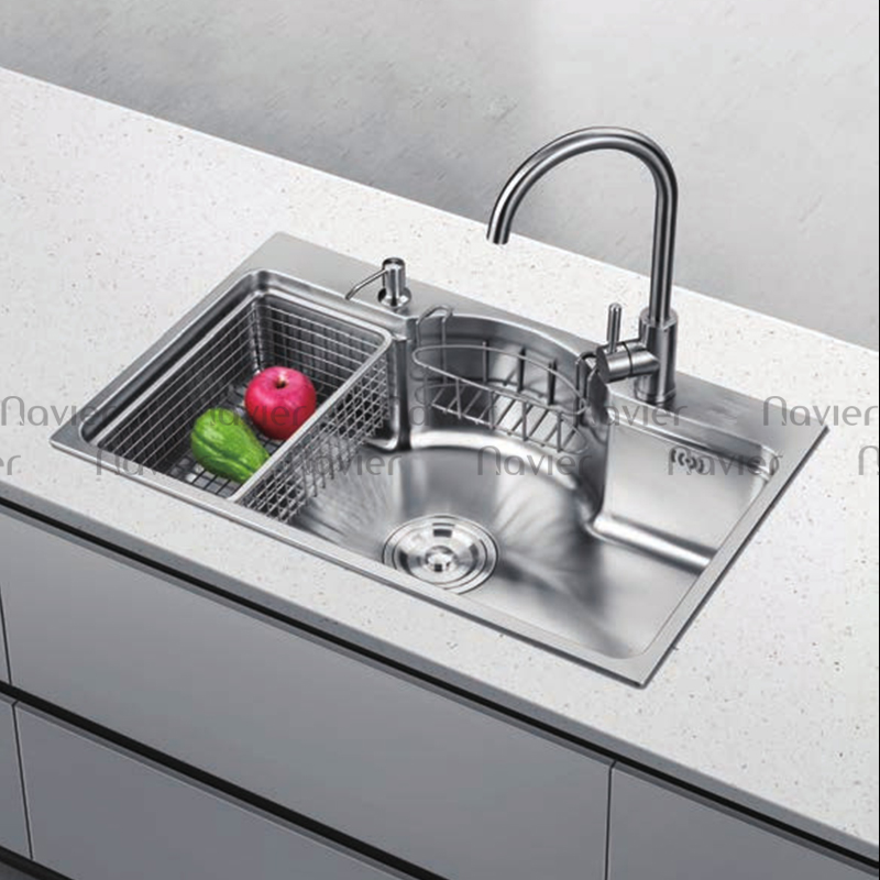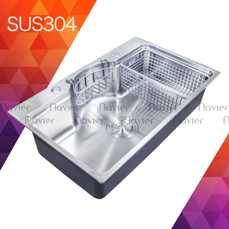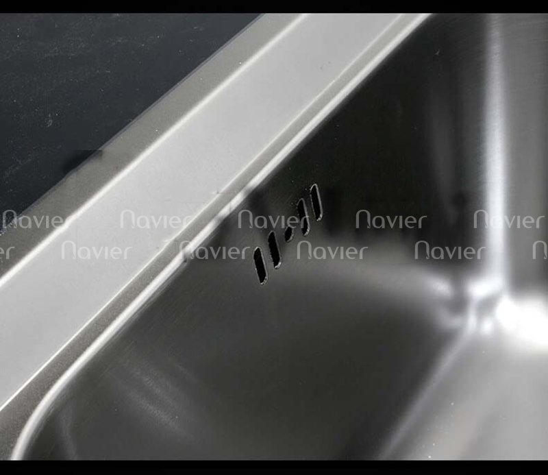 Chậu rửa chén 1 ngăn lớn inox 304 chuẩn 100% cao cấp Navier NV-7546BN304. Đây là sản phẩm phù hợp nhất cho tủ bếp tại bàn đảo, quầy bar hoặc gian bếp có diện tích bàn bếp hạn chế. Chậu đơn, rộng ngang, lòng chậu sâu giúp mở rộng diện tích thao tác trong hố chậu một cách tối đa.