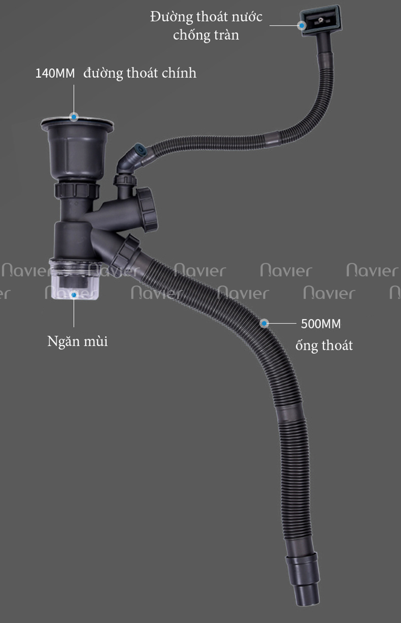 - Phụ kiện đi kèm: Bộ xả thoát nước chống mùi, rổ lọc rác