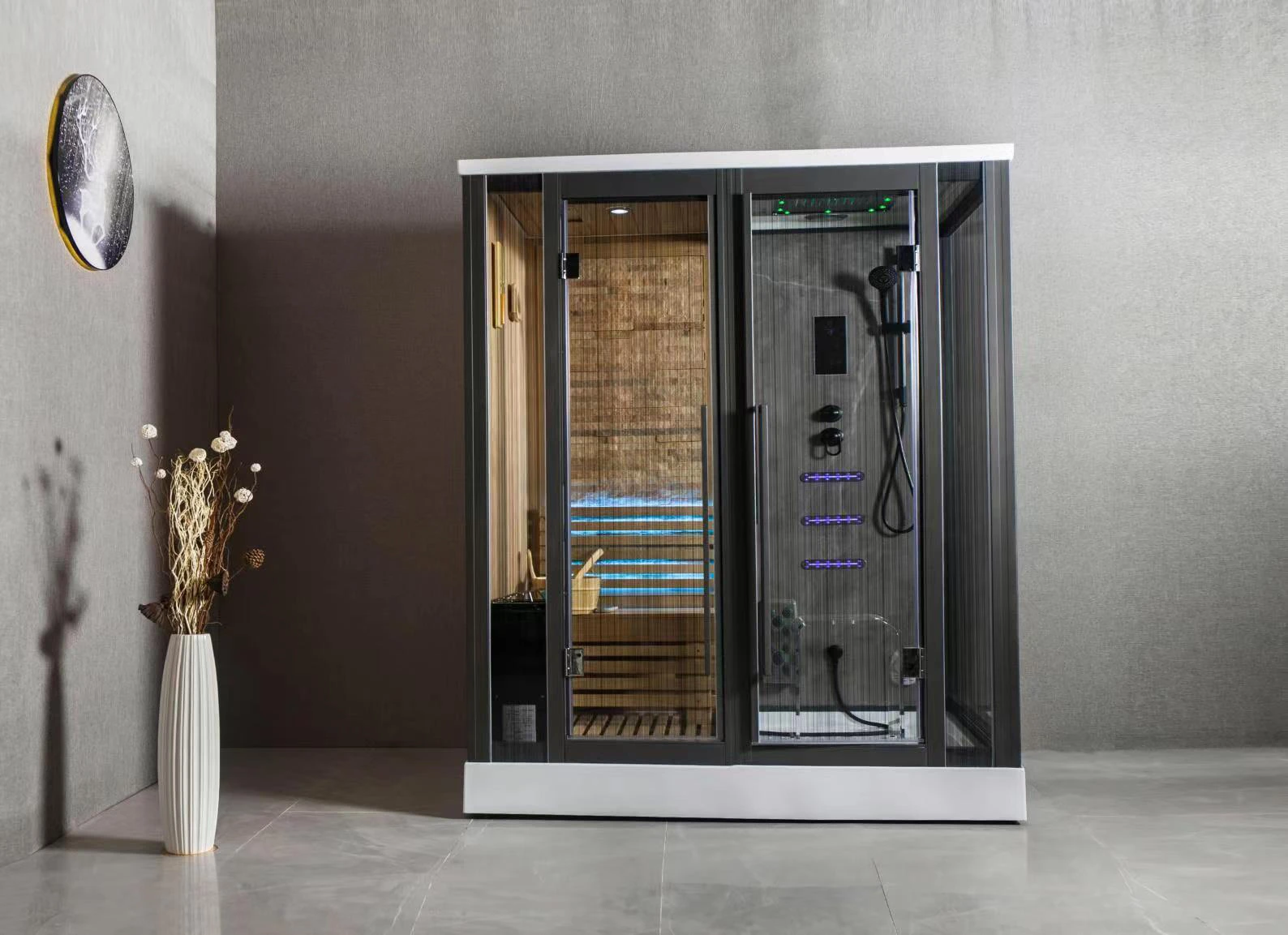 - Nhiệt kế dùng để đo nhiệt độ trong phòng có mặt trước là kính cường lực chịu được nhiệt độ cao, tránh nứt vỡ, đồng hồ cát giúp bạn căn chỉnh được thời gian xông hơi và không thể thiếu hệ thống đèn LED đa sắc màu.