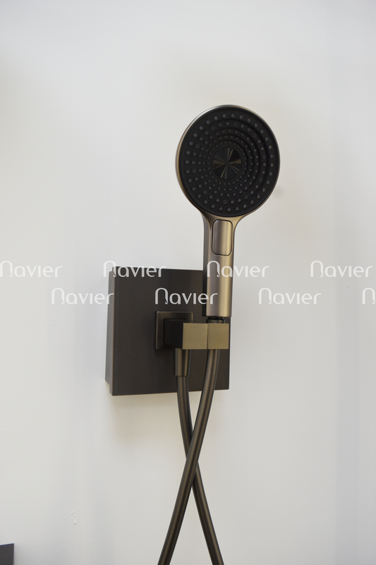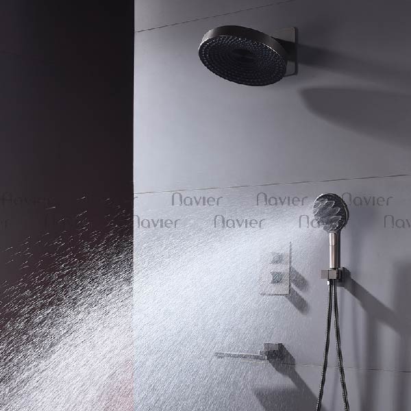 Hình dáng: Thiết kế tối giản, các đường nét vuông vắn, tạo cảm giác mạnh mẽ và tinh tế. Đầu sen trần có hình tròn, trong khi sen tay có thiết kế tròn với nhiều lỗ phun nhỏ, mang đến trải nghiệm tắm thư giãn.