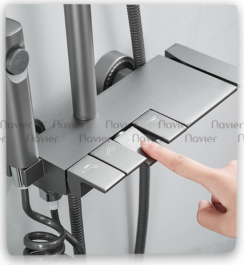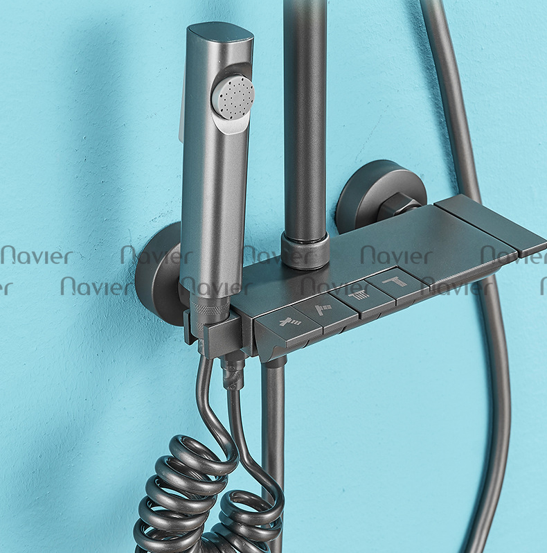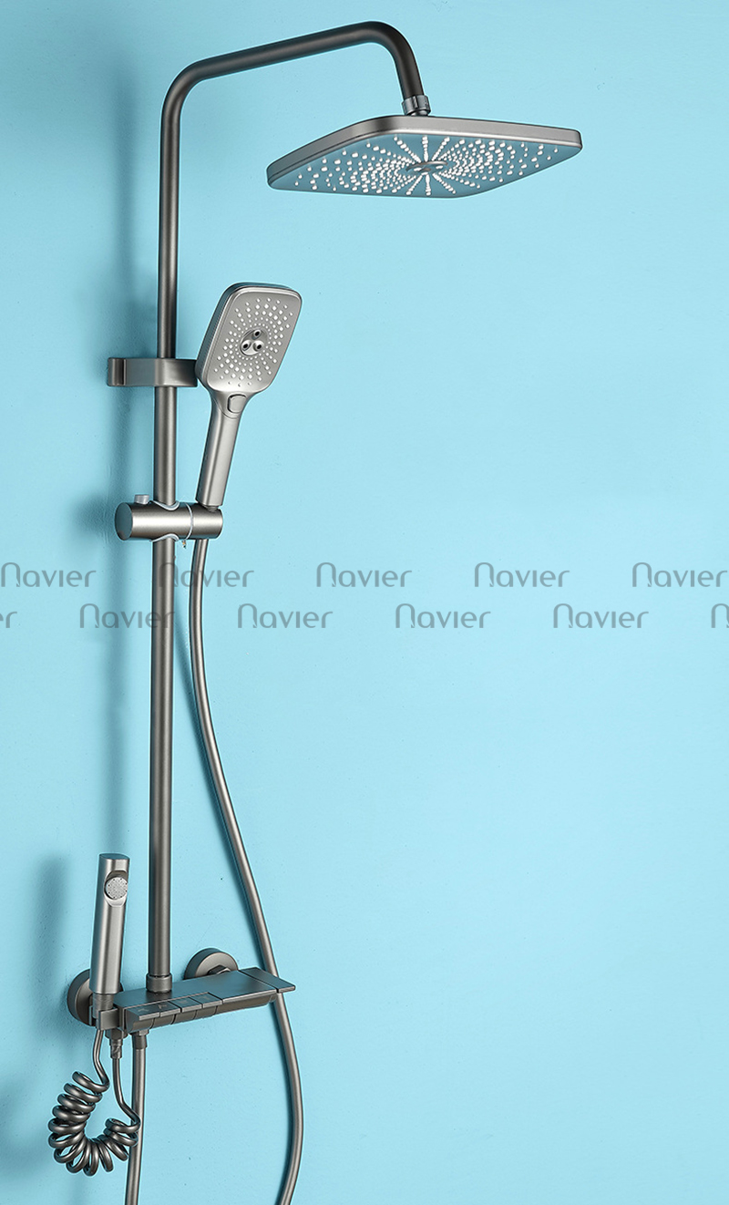 Sen Tắm Đứng Đồng Thau Sơn Tĩnh Điện Xám Phím Đàn 4 Nút Chỉnh Nước Kèm Vòi Xịt Rửa Navier NV-9355XA là một hệ thống vòi phun mưa với tay sen & bát sen tròn không chỉ đem lại cảm giác thoải mái, dễ chịu khi tắm sản phẩm còn giúp không gian phòng tắm trở nên sang trọng & hiện đại hơn. Sản phẩm sen tắm đứng này có thiết kế rất chắc chắn với phần thân được gắn trực tiếp vào tường, có 2 bát sen tiện lợi khi sử dụng.