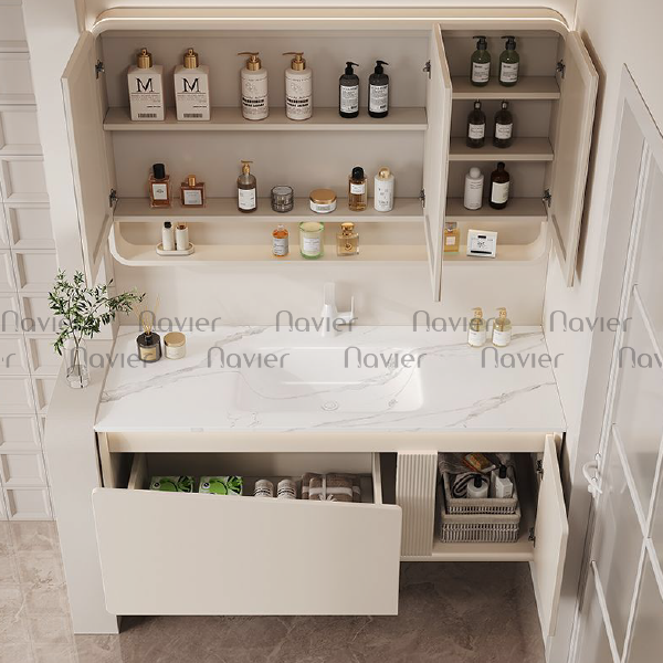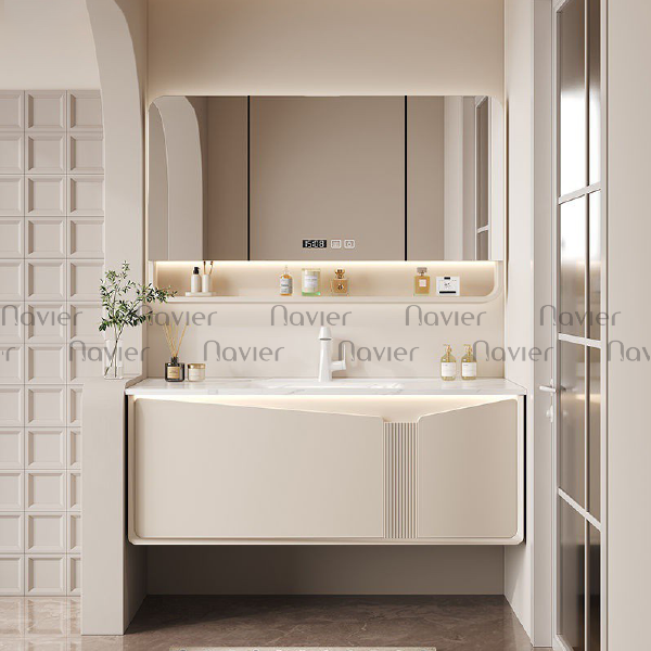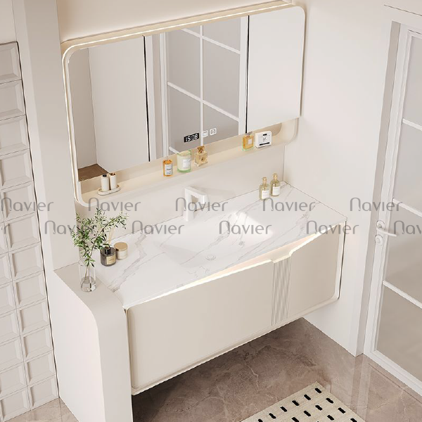 - Dễ dàng vệ sinh: Bề mặt tủ chậu và gương thường được làm từ chất liệu dễ lau chùi, giúp việc vệ sinh trở nên đơn giản hơn.