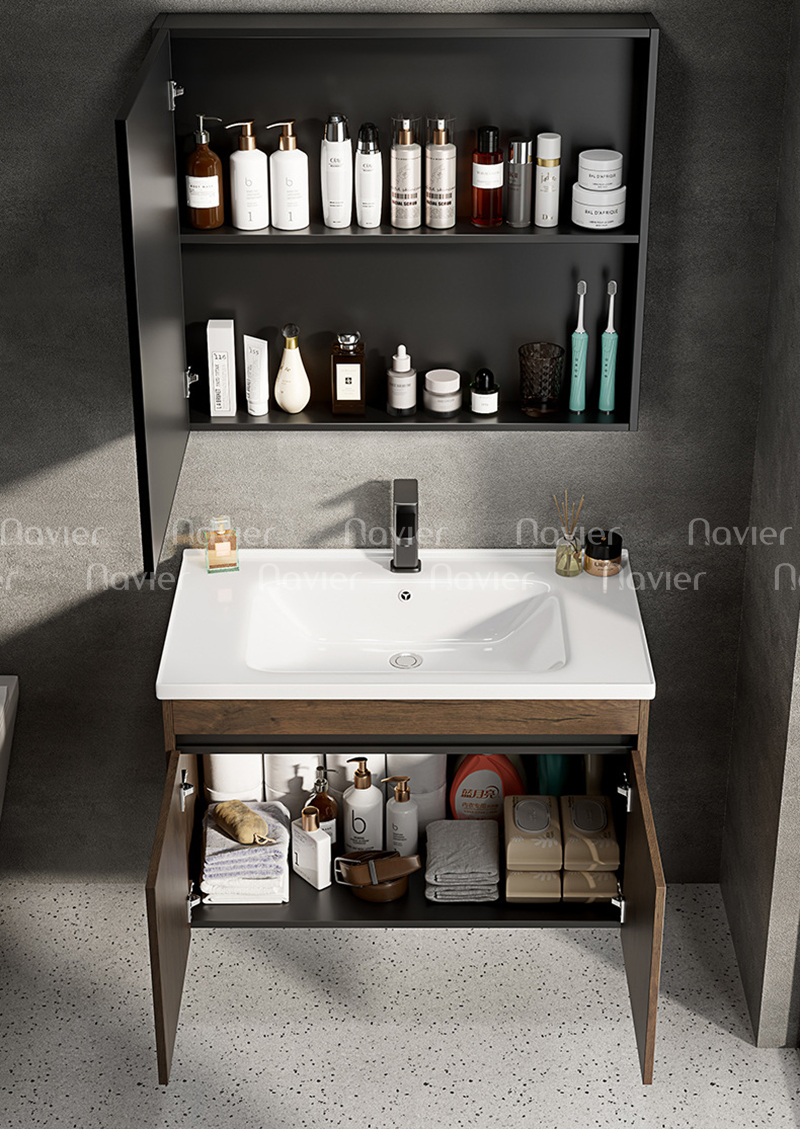 - Ngăn chứa rộng rãi: Bố trí khoa học, giúp tối ưu không gian lưu trữ đồ dùng phòng tắm.