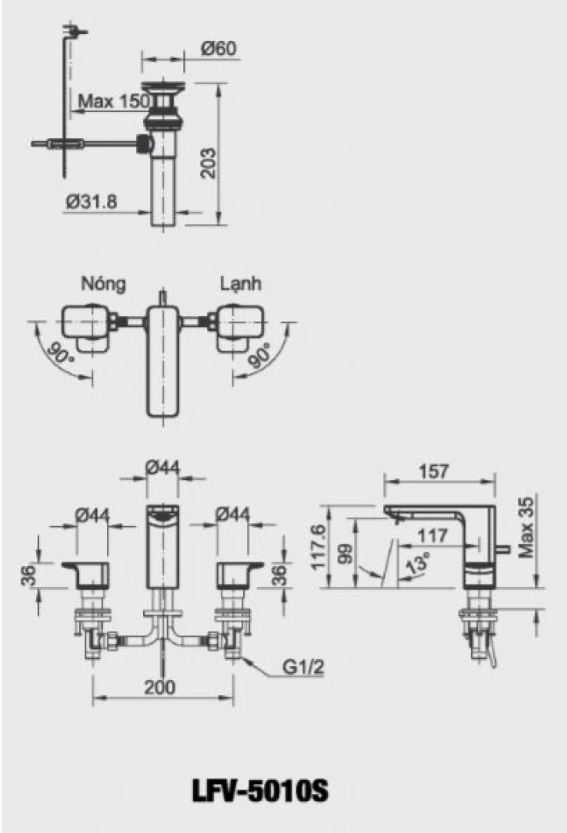 Bản vẽ kỹ thuật vòi lavabo Inax LFV-5010S 3 lỗ