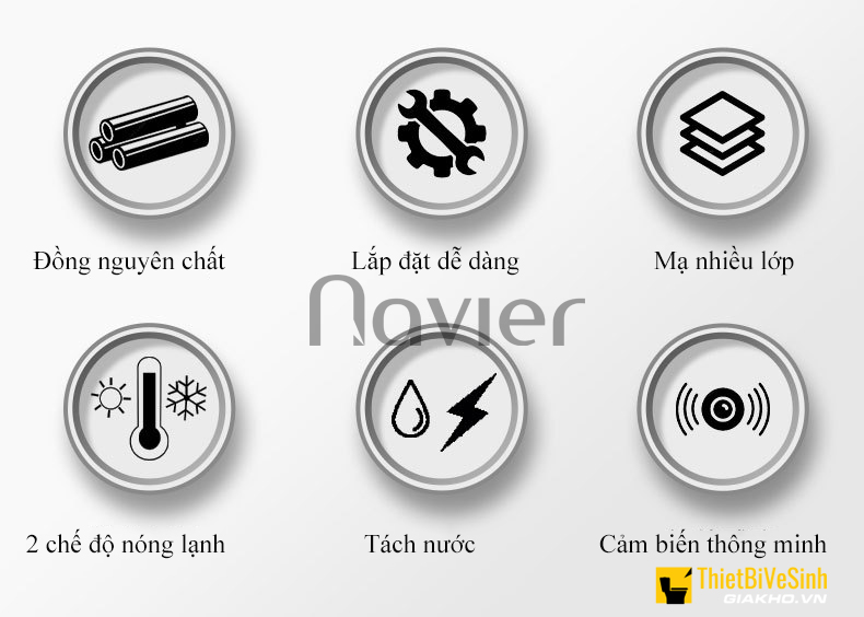 - Vòi lavabo nóng lạnh cảm ứng NV-644 làm từ chất liệu đồng mạ crome và niken cao cấp giúp sản phẩm có bề mặt sáng bóng, chóng han gỉ, không bám bẩn, dễ dàng lau chùi vệ sinh.