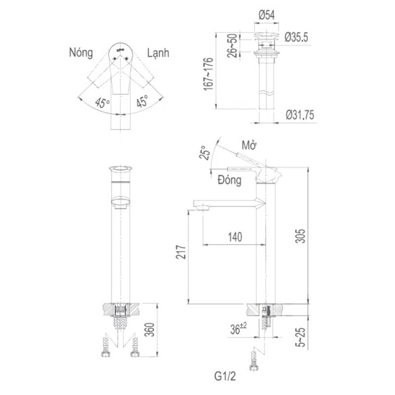 • Áp lực nước : 0.05 MPa ~ 0.75 MPa