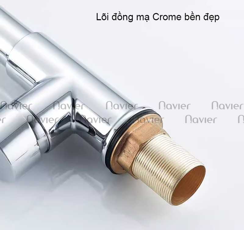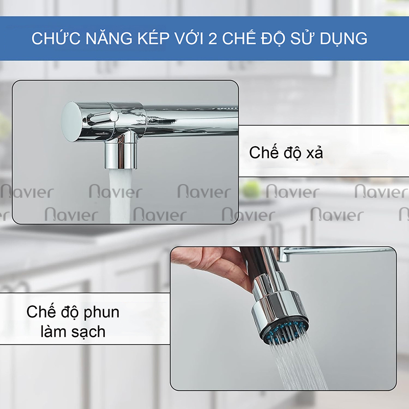 Vòi rửa chén Navier NV-213 chất liệu hợp kim đồng mạ crom & niken có độ bóng cao, chống bám bẩn đảm bảo an toàn vệ sinh cho nguồn nước. Đầu vòi được thiết kế lọc và tạo bọt trong dòng chảy giúp tiết kiệm nước, không bắn nước.