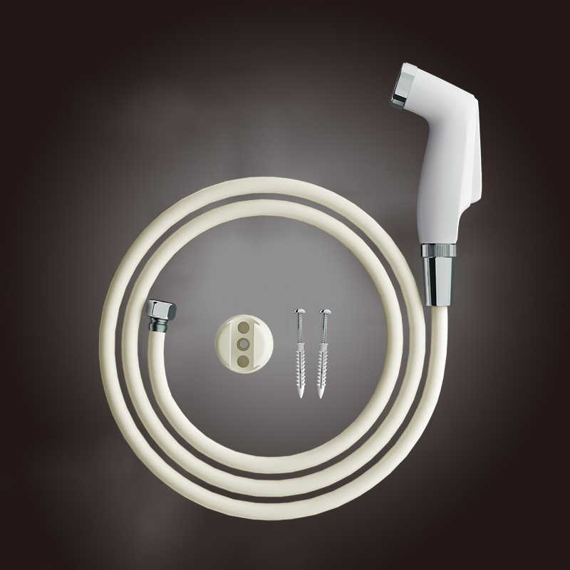 Bộ sản phẩm bao gồm vòi xịt, dây dẫn và đầu kết nối, phù hợp với đa số đầu chờ nước vệ sinh tiêu chuẩn: